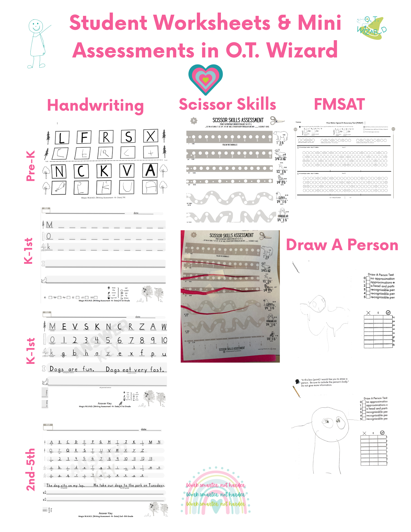 Pro Tip: On the DAP page, write the student name and write the date drawn. Use a clean DAP worksheet to use during therapy once a month (take a pic each time of finished product) and add to their file in OT Wizard or send home to show progress. I've found that the Handwriting Without Tears "Mat Man" song and building intervention works great for learning to draw a picture of a person.
