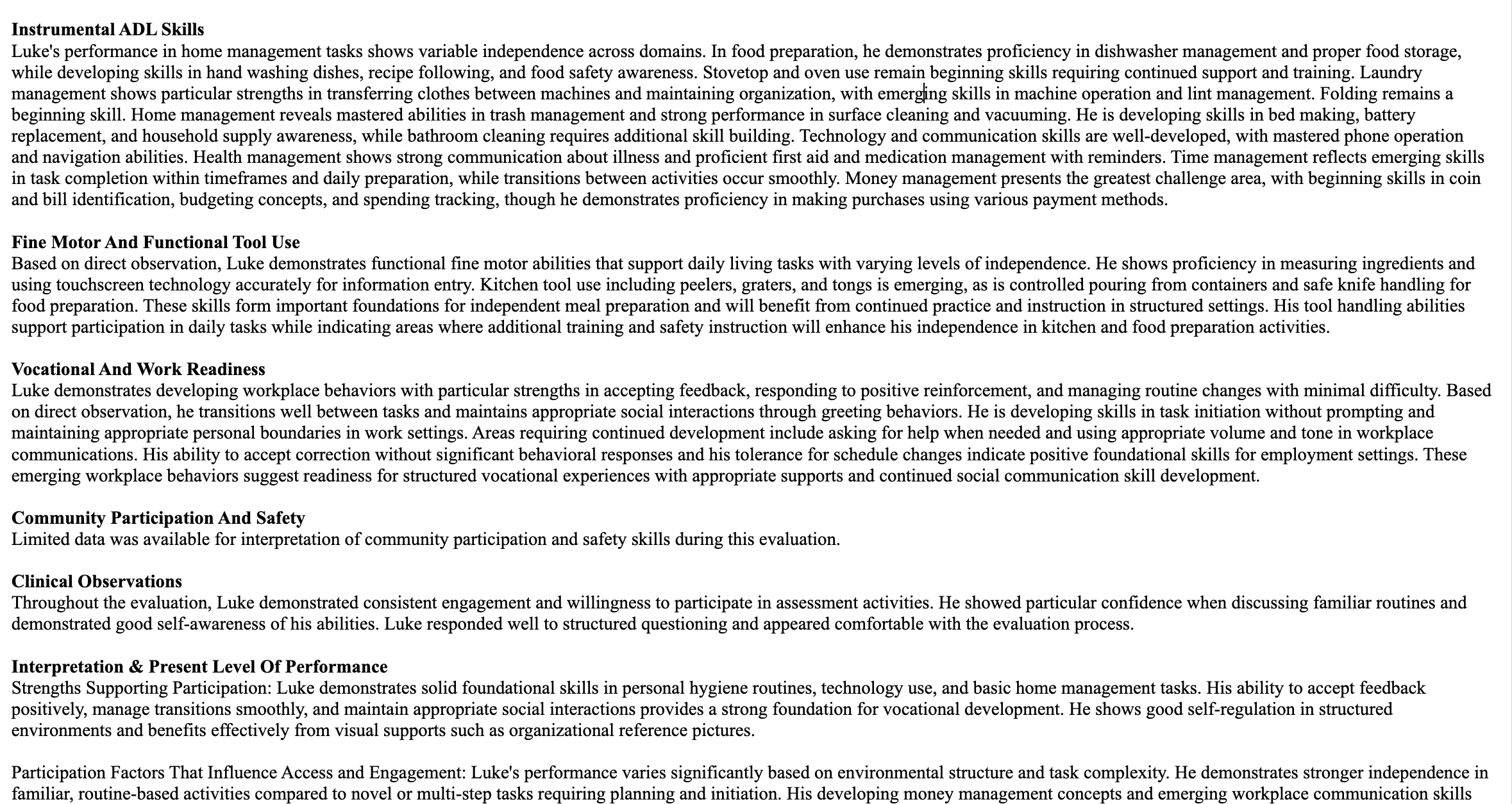 This guided evaluation is intended for individuals ages 11–21 with intellectual, developmental, or related disabilities who require transition-focused evaluation beyond standard developmental formats. It measures performance across five scored domains (Personal ADLs, Instrumental ADLs, Fine Motor & Functional Tool Use, Vocational & Work Readiness, and Community Participation & Safety) using a 0–4 ability rubric that recognizes AT-supported and strategy-supported independence as valid outcomes at every level. Rater flexibility allows scoring from direct observation, caregiver, teacher, or student report, and results are designed to directly inform transition IEP goals and skilled OT service justification under IDEA transition mandates and insurance medical necessity criteria.
