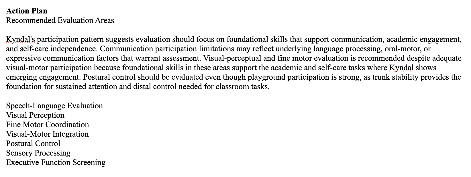 However, we all know that development isn't that clean. A child may be participating in one area in a developmentally appropriate manner but still have some underlying functional deficits that create low participation in another area. For example, development occurs proximal to distal. What if a child has adequate participation in gross motor skills but low participation in visual perceptual skills? Skipping gross motor in your evaluation may not be indicated since gross motor skills (esp trunk stability) lay the development for visual perceptual skills. To help you out, O.T. Wizard will give suggestions of what domains should be included in your evaluation.
